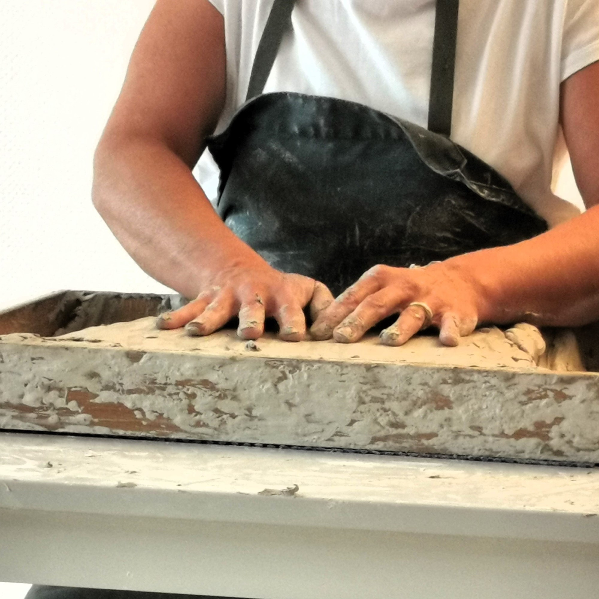 Le dispositif matériel : Un cadre en bois rempli de 20 kg d’argile malléable est posé sur une table rectangulaire. A côté du cadre un bol d’eau tiède.